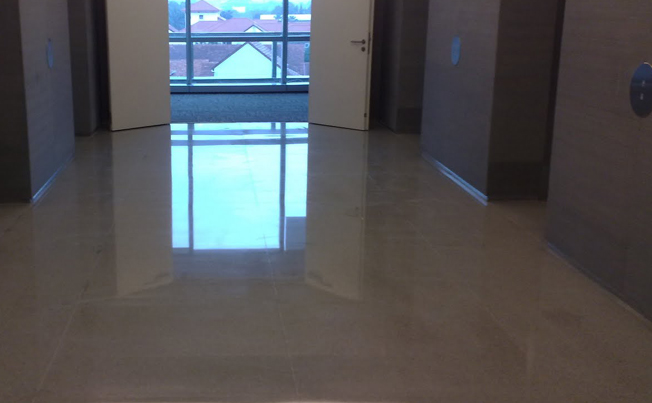 Colonial floor and stone care would put the 200 resin diamonds on the floor machine and hone that area the is etched within the circled area. Then we would put on the 400 resin diamonds and hone the floor but this time feather out over the circled are about and inch. The trick to doing any type of marble restoration is to scratch the floor with a resin diamond then work the way up with resin diamond always going out an extra inch over the previous cut. If a technician doesn’t do this properly the floor will show scratch marks and the floor when powered polish will show the scratches and let me tell you if that is the case that means that the floor will need to be redone to establish which resin grit that scratch came from then have to work that scratch out then proceed up the resin diamond grits then re polish the floor. Now let’s get back to this example, after the four hundred resin cut is completed it is time to change resin diamonds and put on the 800 resin diamonds, remember we always overlap the previous cut. Then it is time to polish the floor and enjoy the high shine floor again. This is the time to re apply sealer on the floor to repeal any future stain from absorbing in the the stone.